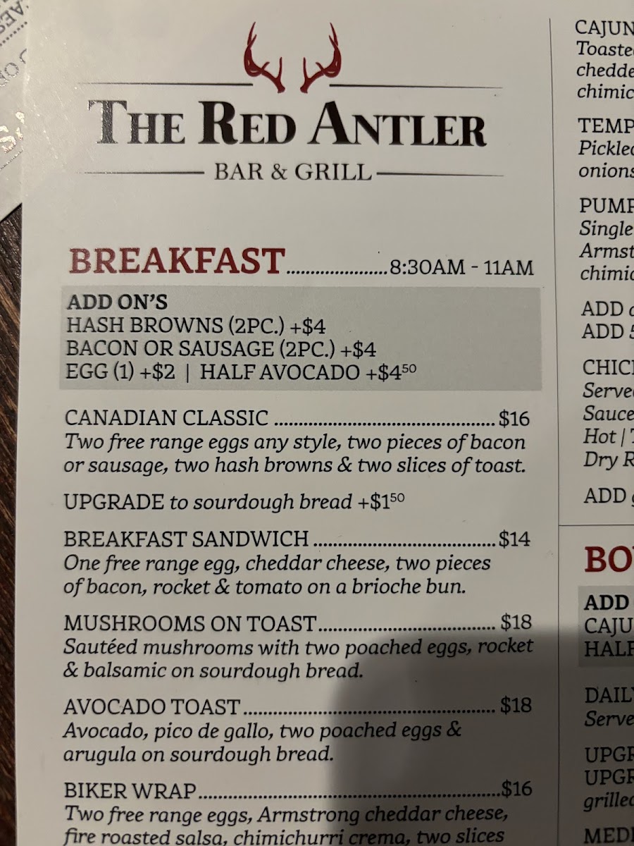 The Red Antler offers a relaxed and approachable menu that fits perfectly with its mountain setting in Vernon, BC. Here, you’ll find a blend of casual bites and comforting meals designed to satisfy after a day outdoors or simply to enjoy in a cozy atmosphere. The menu balances hearty dishes like the Elk Burger and Bacon Cheese Burger with lighter, fresher options such as the Med Falafel Salad and Avocado Quinoa Powder Bowl.
